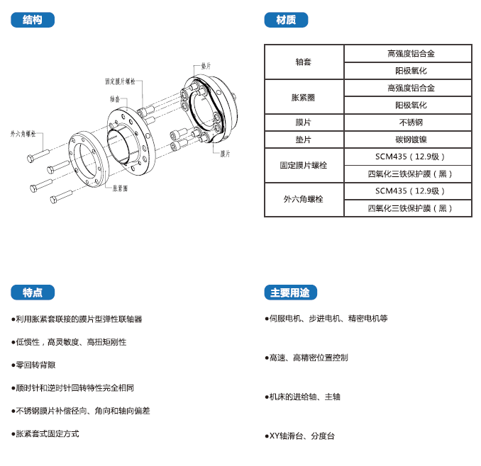 DFP-T系列聯軸器采用高強度鋁合金材料,經過陽極氧化處理,廣泛用于伺服電機、步進電機、精密電機等。