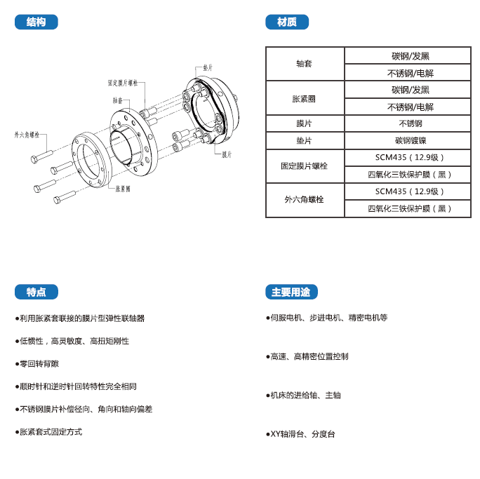 DFPS-T系列聯軸器采用碳鋼發黑,利用脹緊套聯接的膜片型彈性聯軸器,廣泛用于伺服電機、步進電機、精密電機等。