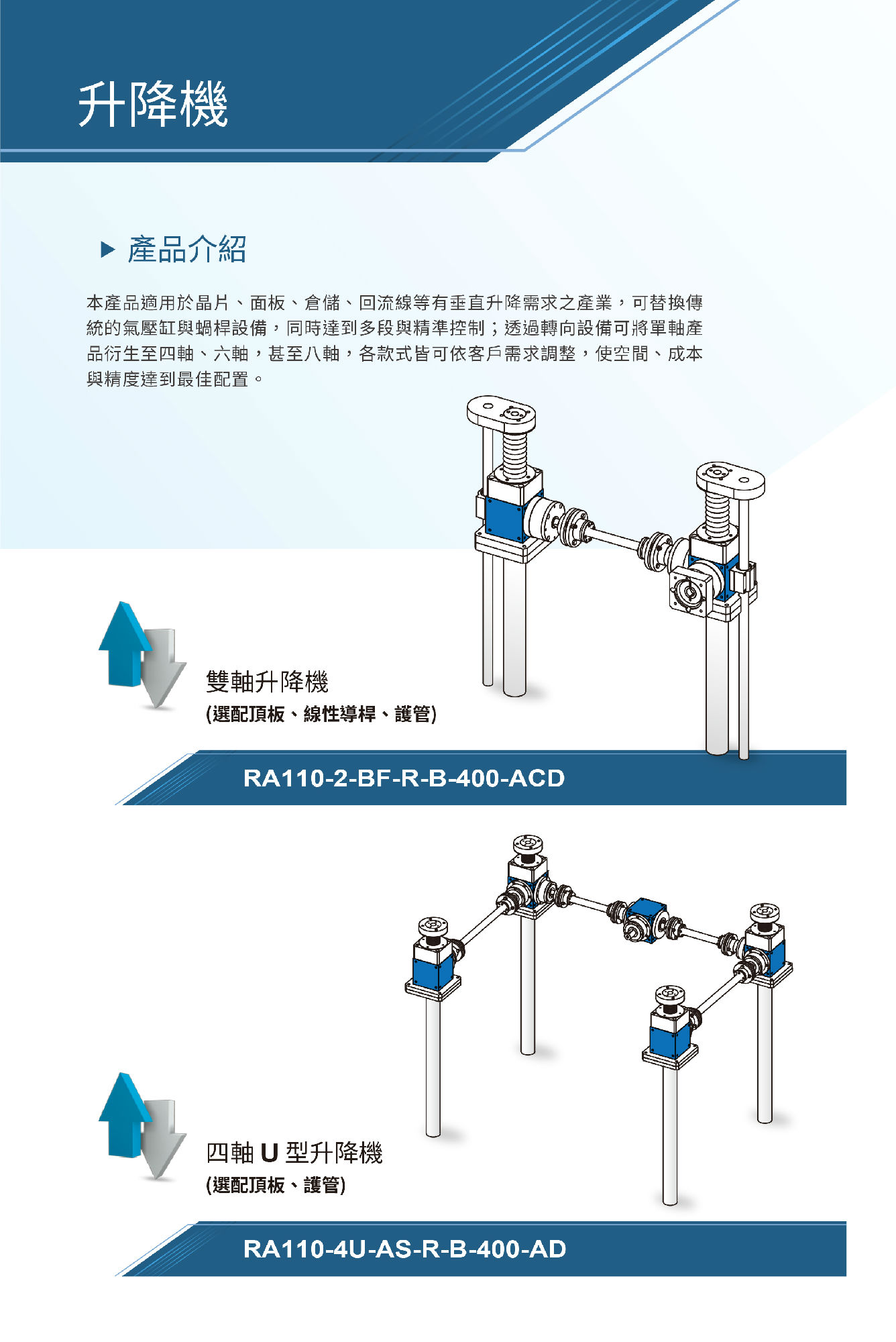 BF系列雙軸升降機可選配頂板,線性導桿,護管。適用于晶片、面板、倉儲、回流線等有垂直升降需求的產業,可替換傳統的氣壓罐與蝸桿設備,同時達到多段與精準控制。