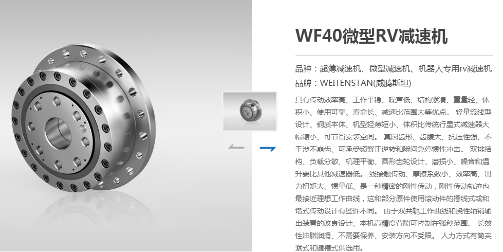 二、RV減速機是新興起的一種減速機,它是在傳統針擺行星減速機的基礎上發展出來的,不僅克服了一般針擺減速機的缺點,RV減速機具有傳動效率高、工作平穩、噪聲低、結構緊湊、重量輕、體積小、使用可靠、壽命長、減速比范圍大等優點。輕量流線型設計、鋼質本體、機型輕薄短小、體積比傳統行星式減速器大幅縮小、可節省安裝空間。真圓齒形、齒腹大、抗壓性強、不干涉不崩齒、可承受頻繁正逆轉和瞬間急停慣性沖擊。雙排結構、負載分散、機理平衡、圓形齒輪設計、磨損小、噪音和溫升要比其他減速器低。線接觸傳動、摩擦系數小、效率高、出力扭矩大、慣量低、是一種精密的剛性傳動,剛性傳動軌跡也最接近理想工作曲線,這和部分原件使用滾動件的擺線式或和諧式傳動設計有些許不同。由于雙共軛工作曲線和撓性軸銷輸出裝置的改良設計、本機高精度背隙可控制在弧秒范圍。長效性油脂潤滑、不需要保養、安裝方向不受限。人力方式有筒夾緊式和鍵槽式供選用。