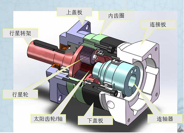 精密斜齒行星減速機的結(jié)構(gòu)是十分緊湊的,從上圖中我們可以看出行星減速機的結(jié)構(gòu)也是十分簡單的,主要包括:連接板、聯(lián)軸器、下蓋板、太陽齒輪、行星輪、內(nèi)齒圈、上蓋板和行星轉(zhuǎn)架。