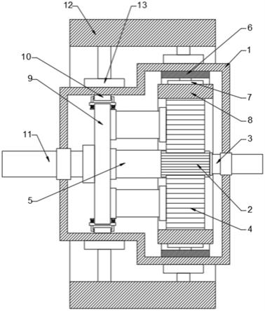 行星減速機的功能是在降低與之相連接的電機的轉速的同時輸出更大的轉矩,因此被廣泛利用與各行各業中,且對各類與之相連接的設備運行精度均有較大影響,由于行星減速機的內部的太陽輪和行星輪需要通過卡齒嚙合配合轉動,而多個齒輪配合轉動時往往會發生震動,震動不僅會導致內部結構之間配合精度降低,導致行星減速機的傳動精度下降,震動過于激烈時還易造成部件的損毀,縮短行星減速機的使用壽命,且行星減速機的震動導致其與其他裝置或機構的連接固定點松動,且震動還會被傳遞至其他裝置或機構上,從而擴大震動造成的不利影響,針對以上問題,可以提出一種新型行星減速機,通過在行星減速機的內部和外部同時增設減震機構,起到多重減震的效果,提升行星減速機的傳動穩定性。