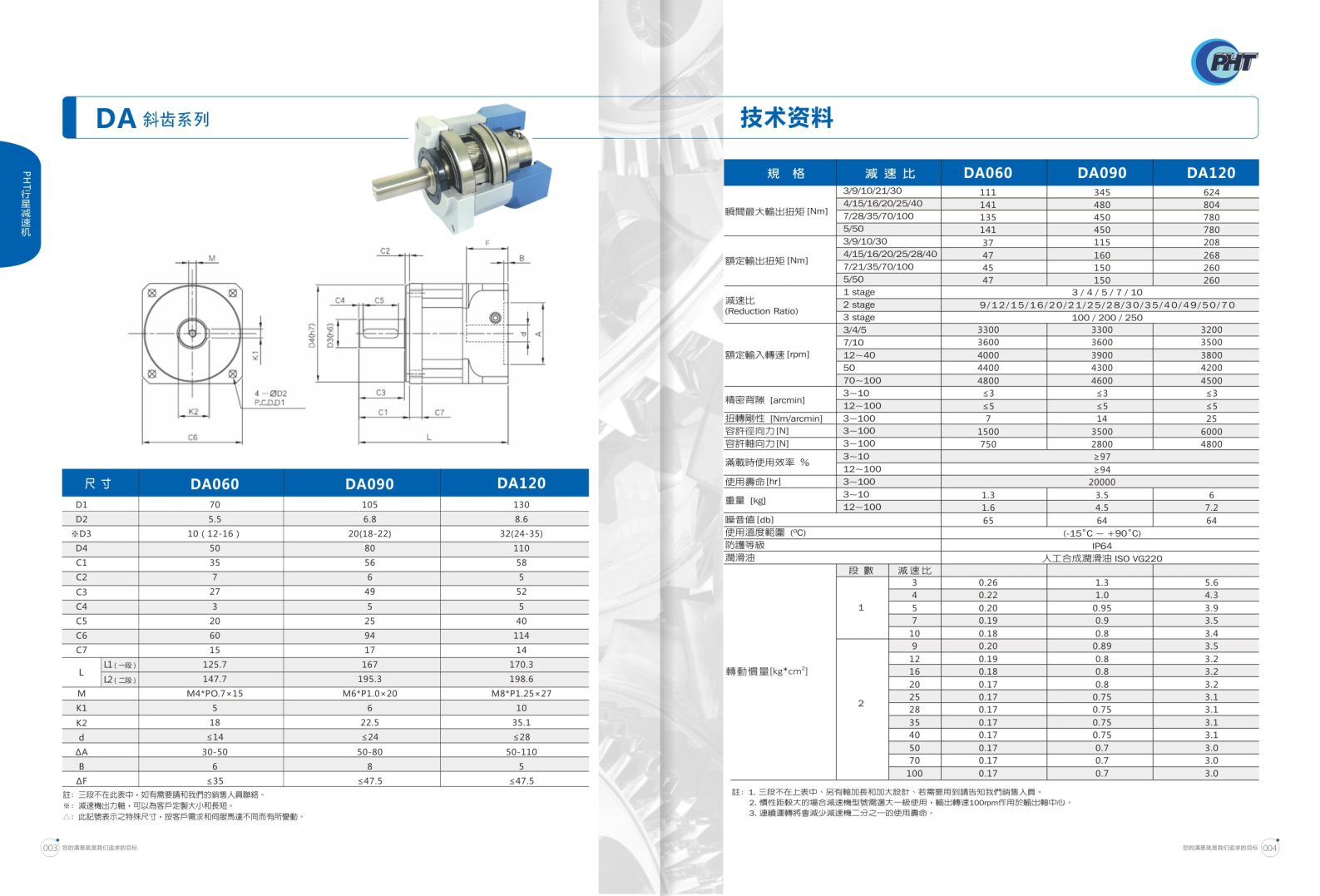 DA 系列是斜齒輪高精度減速機。 品宏減速機的軸承是用NSK品牌的,齒輪經過碳化,故精度和剛性都比較優越!減速機出力軸是可根據客戶的要求去定制大小和長短的。
