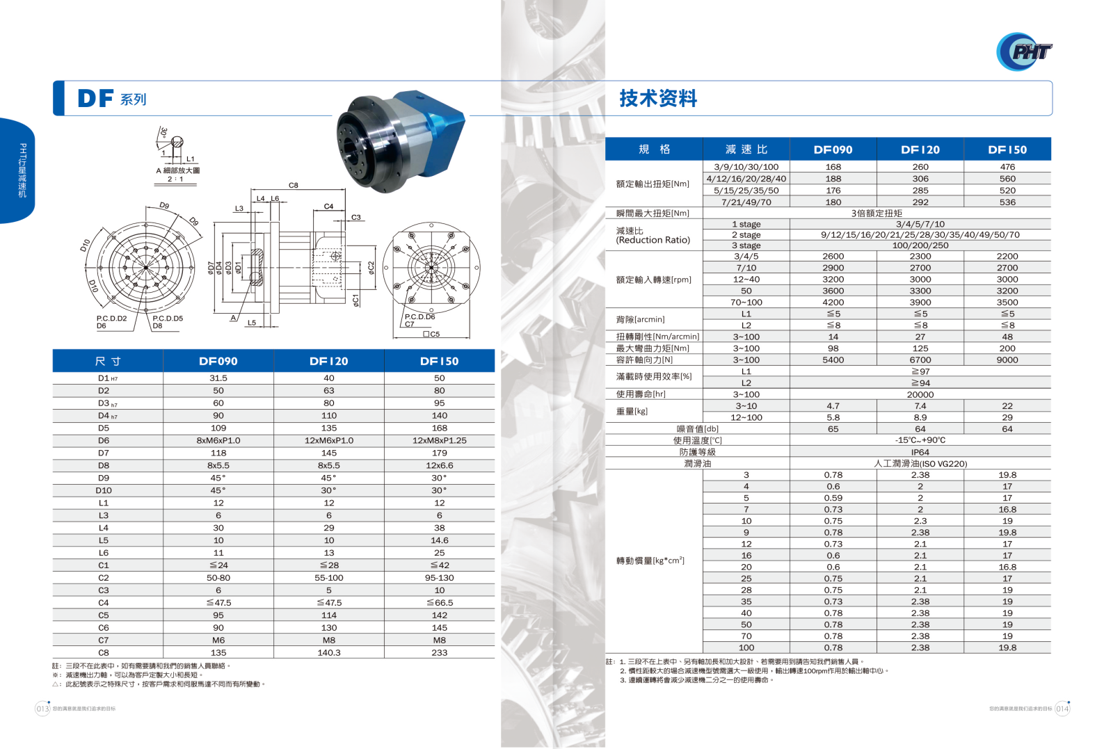 DF 系列是法蘭輸出高精度減速機。 品宏減速機的軸承是用NSK品牌的,齒輪經過碳化,故精度和剛性都比較優越!減速機出力軸是可根據客戶的要求去定制大小和長短的。