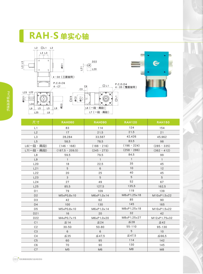 RAH-S系列是單實心軸設計。 鋁合金材質可提高散熱能力,減緩溫升現象造成影響。 多樣化的出力軸可因應各種場合,客制化的入力端可搭配各式馬達。 提供各式特色之減速機,供使用者依需求選購。 特殊油封設計,正常使用下不需保養亦不用更換潤滑油,可延長使用壽命。 各式特色,體積小,省空間,噪音低,輸出扭矩高,安裝容易,可搭配馬達型號廣泛。 RAH搭配DM,一體成型的齒輪組,可有效的減低噪音。 RAH搭配DH,最佳的性價比,可廣泛應用于各種場合。