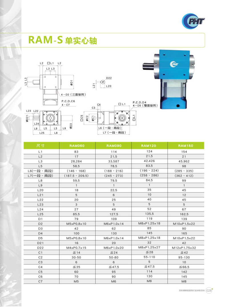 RAM-S系列是單實心軸設計。 鋁合金材質可提高散熱能力,減緩溫升現象造成影響。 多樣化的出力軸可因應各種場合,客制化的入力端可搭配各式馬達。 提供各式特色之減速機,供使用者依需求選購。 特殊油封設計,正常使用下不需保養亦不用更換潤滑油,可延長使用壽命。 各式特色,體積小,省空間,噪音低,輸出扭矩高,安裝容易,可搭配馬達型號廣泛。 RAM搭配DM,一體成型的齒輪組,可有效的減低噪音。 RAM搭配DH,最佳的性價比,可廣泛應用于各種場合。