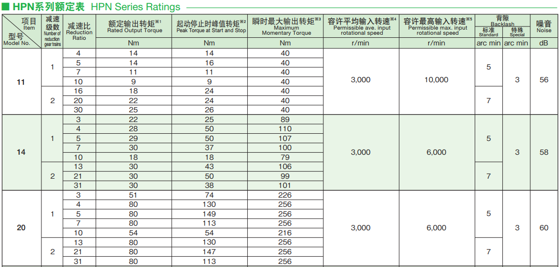 HPN系列高精度行星齒輪減速機,可簡單的安裝到各公司的伺服電機上。 諧波發生器:橢圓形凸輪的外圈上嵌入薄型的滾珠軸承,整體呈一橢圓形狀的零件。軸承的內圈固定于凸輪之上,外圈則介由滾珠彈性變形。一般安裝在輸入軸上。 柔輪:具有薄壁杯型的金屬彈性體的零件。杯的開口部外圈刻有齒形。柔輪的底部稱為膜,通常安裝到輸出軸上。 剛輪:剛性環狀的零件。內側上刻有與柔輪同樣大小的齒形,且比柔輪多2個齒數。一般固定在外殼上。