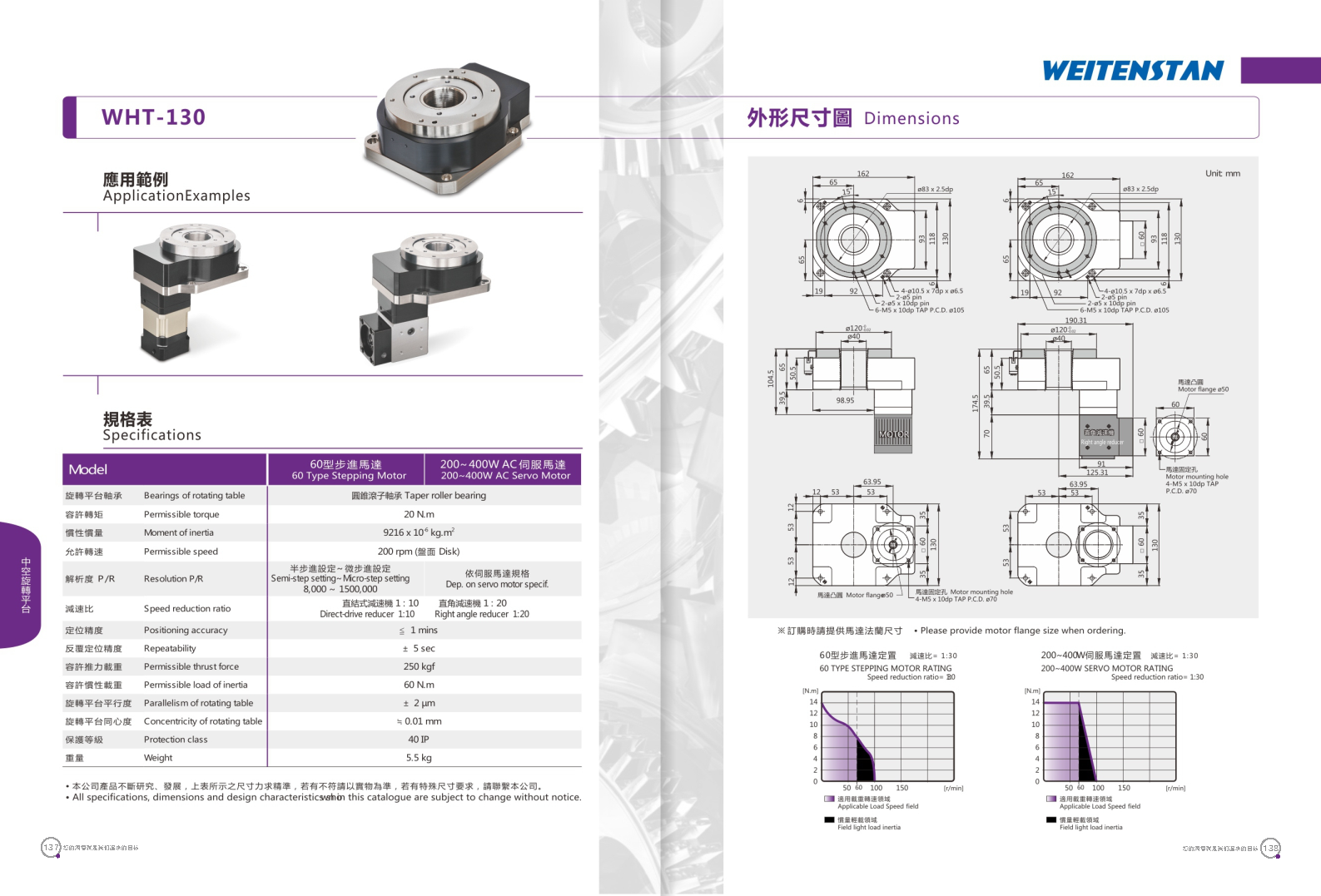 WHT系列中空旋轉平臺。 具有優異定位精度與重復精度的中空旋轉平臺,可搭配使用伺服馬達或步進馬達,展現獨特的性能可靠度。 工作物可直接鎖固。旋轉盤面可直接鎖固工作物,提升工件裝載之方便性。 配線方便。此旋轉平臺為中空式設計,無論是配線或配管均方便。 高精度。定位精度小于1分。重復精度可達±5秒。 運轉動作平穩。盤面轉動平穩,順暢,且定位快速。 適用各種馬達。中空旋轉平臺可采用各種廠牌之伺服馬達或步進馬達驅動。