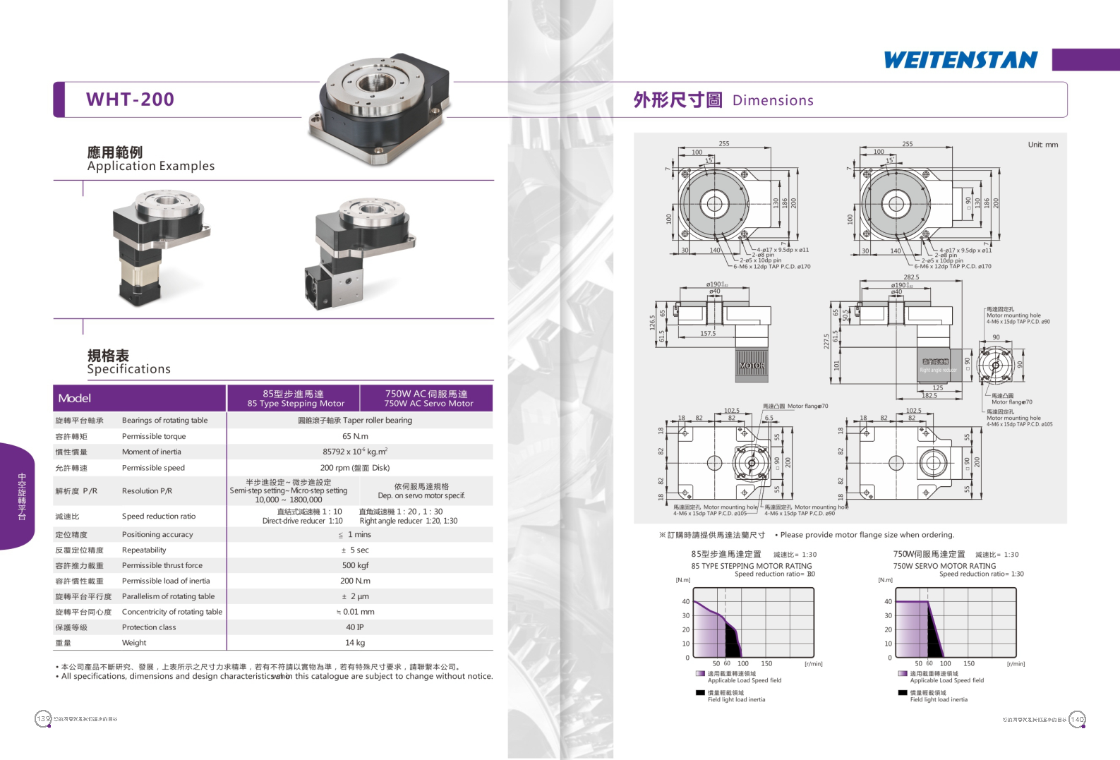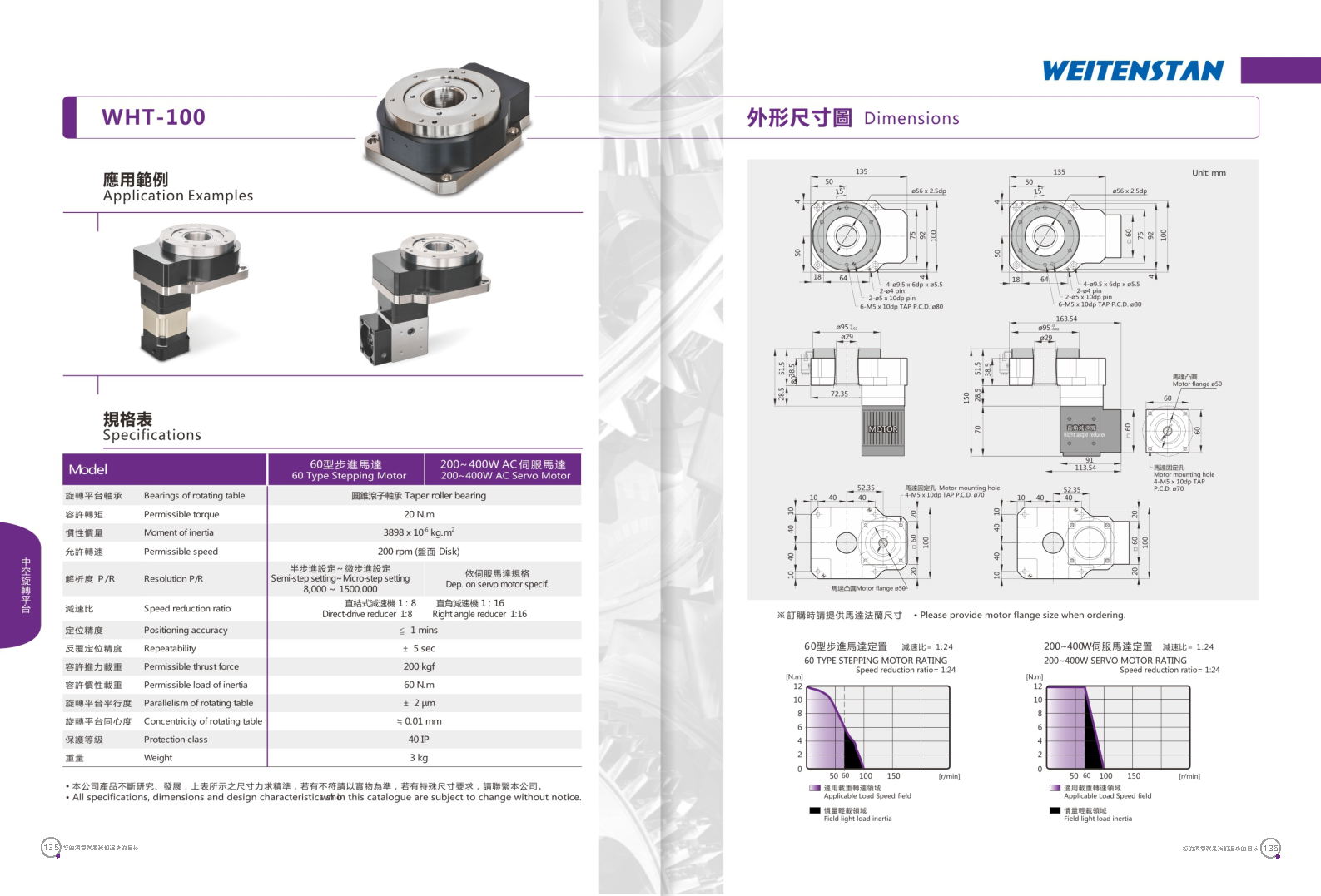 WHT系列中空旋轉(zhuǎn)平臺。 具有優(yōu)異定位精度與重復(fù)精度的中空旋轉(zhuǎn)平臺,可搭配使用伺服馬達或步進馬達,展現(xiàn)獨特的性能可靠度。 工作物可直接鎖固。旋轉(zhuǎn)盤面可直接鎖固工作物,提升工件裝載之方便性。 配線方便。此旋轉(zhuǎn)平臺為中空式設(shè)計,無論是配線或配管均方便。 高精度。定位精度小于1分。重復(fù)精度可達±5秒。 運轉(zhuǎn)動作平穩(wěn)。盤面轉(zhuǎn)動平穩(wěn),順暢,且定位快速。 適用各種馬達。中空旋轉(zhuǎn)平臺可采用各種廠牌之伺服馬達或步進馬達驅(qū)動。